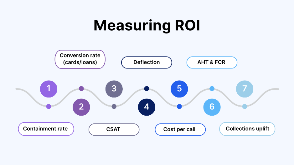 ROI comes from call center automation and higher first-contact resolution. Track containment, average handle time (AHT), first call resolution (FCR), CSAT, deflection, cost per call, and collections recovered. Mature programs report double-digit AHT reductions and 60–90% containment on Tier-1 intents, improving service quality while lowering operating costs at scale.