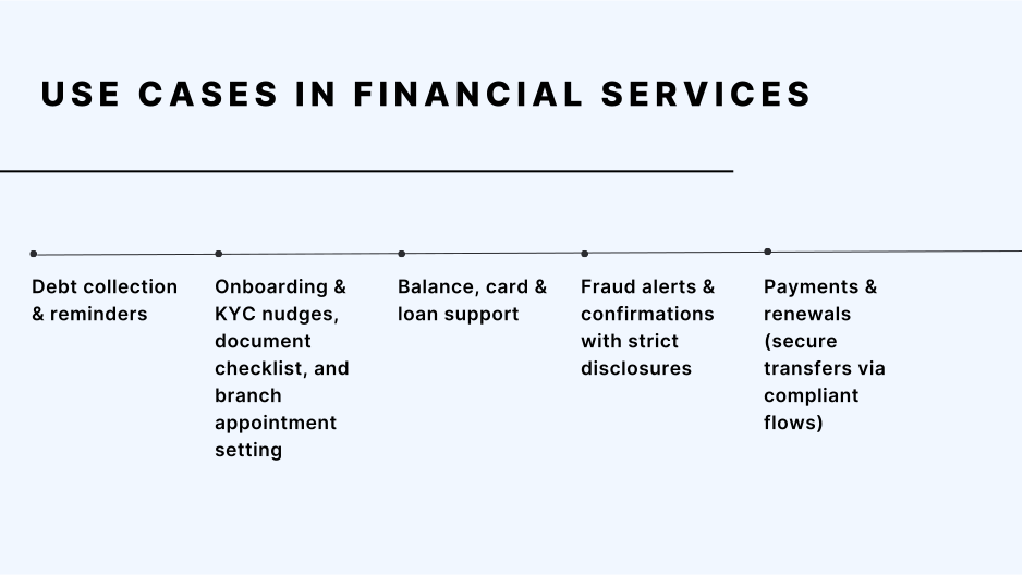Common use cases in banking / financial services include debt-collection reminders, KYC nudges, card controls, balance and payoff quotes, fraud confirmations, and renewals. Agents also schedule branch appointments, verify identity, and deliver disclosures verbatim. Each workflow benefits from fast resolution, consistent policy adherence, and complete audit trails.