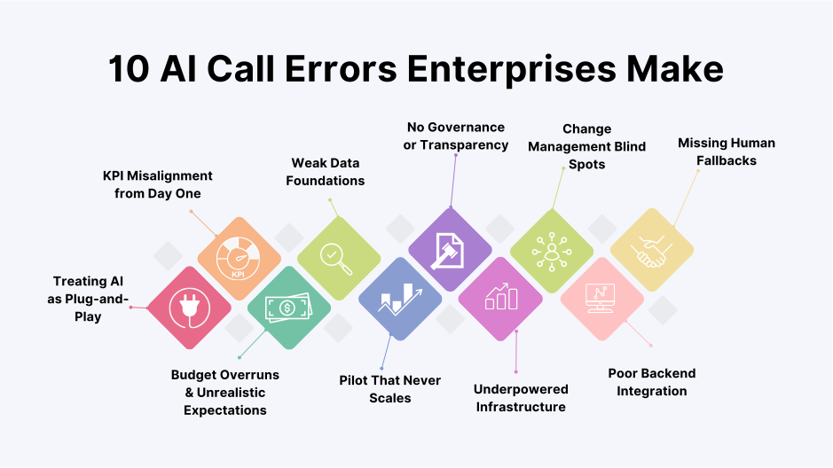 The most common issues include AI call rollout mistakes like treating systems as plug-and-play, weak data foundations, and missing governance & transparency. Teams skip integration and change management, causing KPI drops and cost overruns.