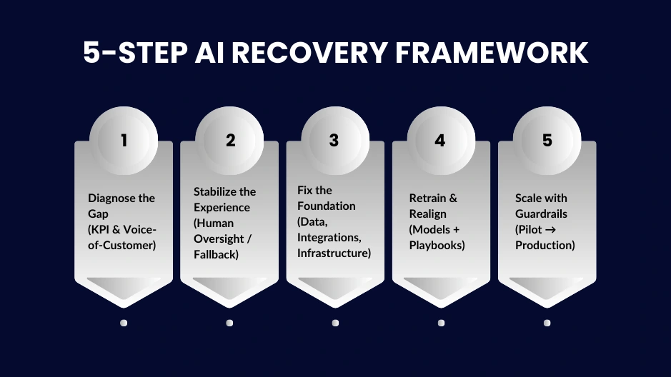 Use a five-step recovery framework for failed AI rollout: diagnose KPI gaps, stabilize with human oversight/fallback, fix foundations (data, integrations, infrastructure), retrain models to address model drift, and scale via pilot gates with SLOs. Tie changes to ROI and cost-to-serve, then publish a governance calendar to keep improvements durable.