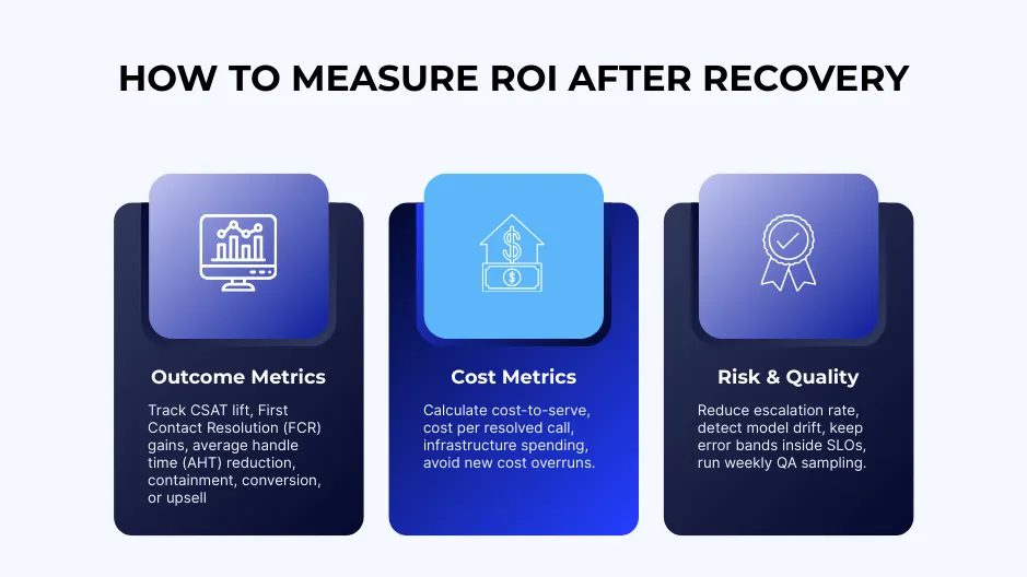 Calculate cost-to-serve using telephony, model usage, and staffing. Track the cost per resolved call before and after recovery. Watch infrastructure spending during scale to avoid new cost overruns.