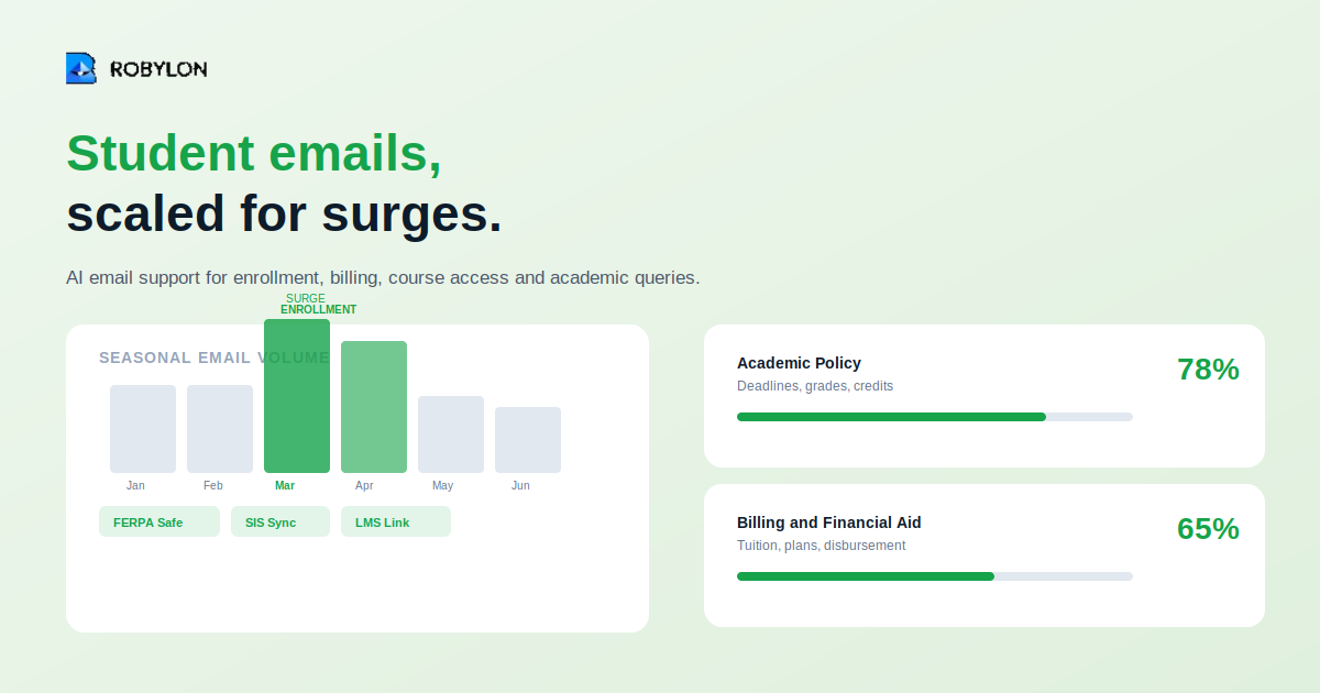 Handle enrollment surges without seasonal hiring. Robylon AI integrates with your SIS and LMS to resolve student emails automatically β from application status to course access issues. Start free at robylon.ai