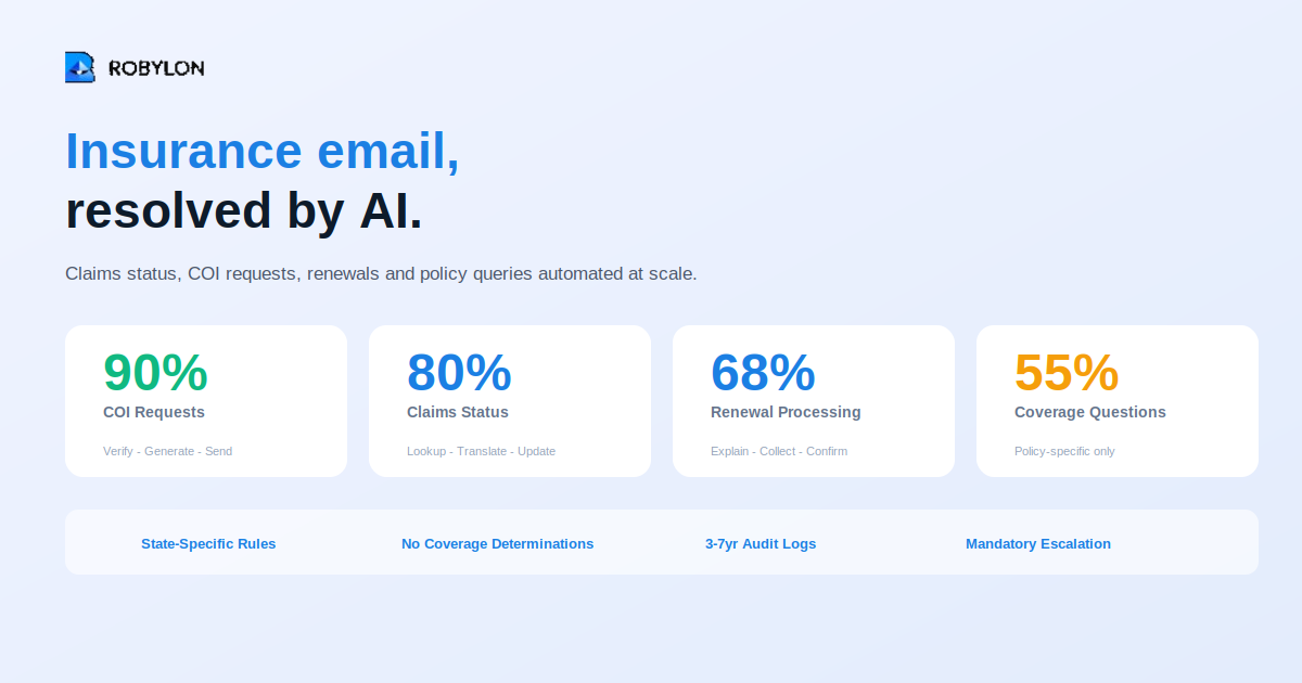Automate the repetitive 80% of insurance emails. Robylon AI connects to your claims and policy systems to resolve status inquiries, generate COIs, and process renewals β without compliance risk. Start free at robylon.ai