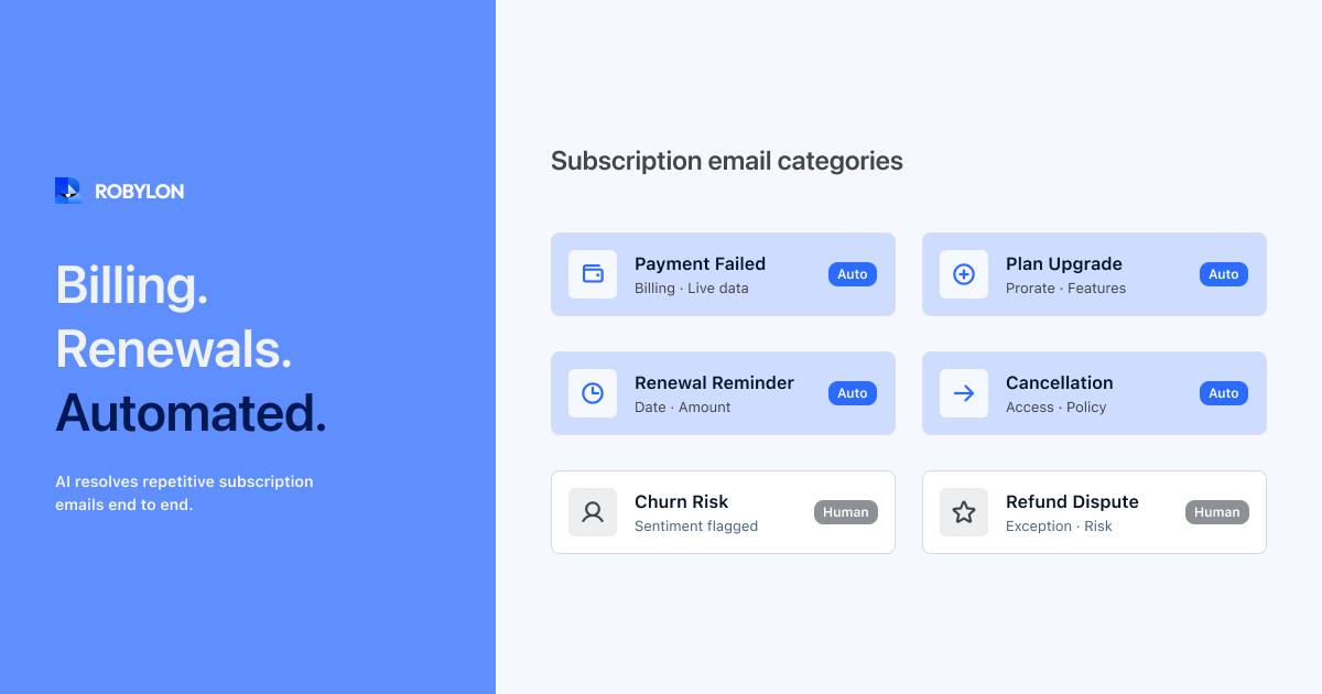 Protect your recurring revenue. Robylon AI auto-resolves billing queries, recovers failed payments, processes plan changes, and routes cancellation signals to the right team β connected to Stripe, Chargebee, and your CRM. Start free at robylon.ai