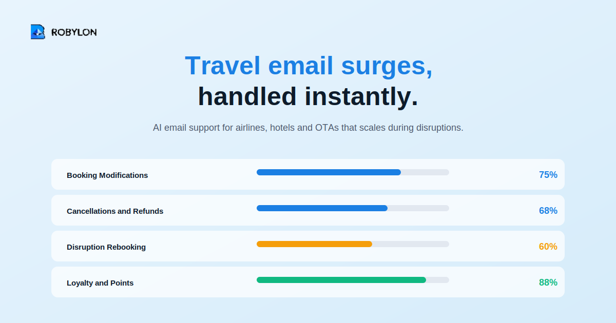 Handle travel email surges without hiring sprees. Robylon AI integrates with booking systems and scales instantly during disruptions β resolving 60β75% of travel emails automatically. Start free at robylon.ai