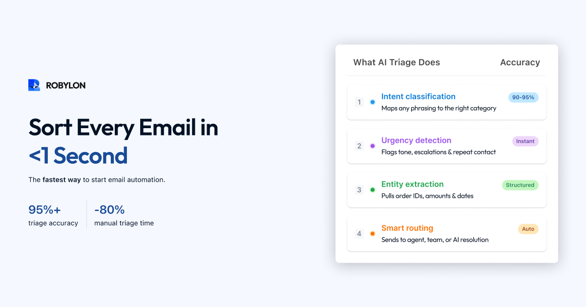 Triage is just the beginning. Robylon AI classifies, routes, and prioritizes email tickets in milliseconds β then goes further by resolving 70% of them end-to-end. Start free at robylon.ai