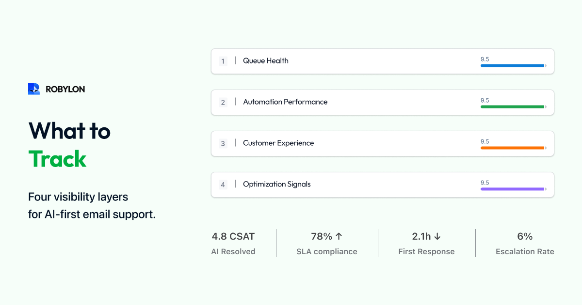 Data sources: your AI email platform (BRR, confidence scores, knowledge gaps), your helpdesk (ticket data, SLA tracking, CSAT), and your HR/finance system (agent costs for cost-per-ticket calculations). Most AI platforms like Robylon provide built-in dashboards covering Layers 1 and 2. For Layers 3 and 4, you may need to export data to a BI tool (Looker, Tableau, Metabase) or use the platform's API.