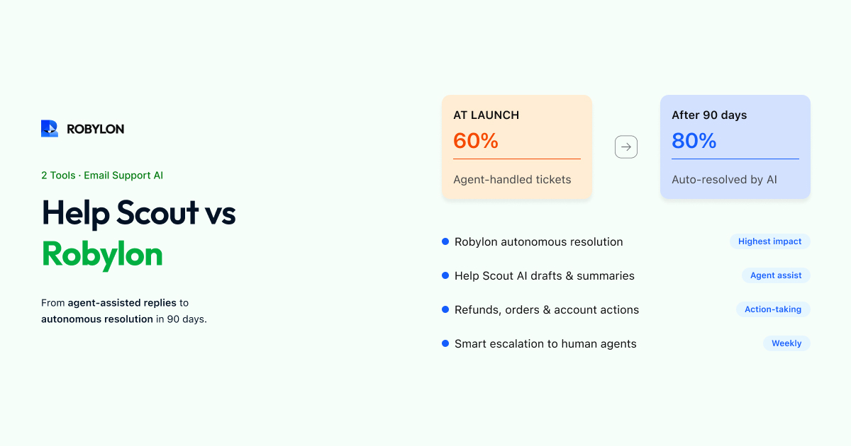 Help Scout AI is agent-assist: AI Drafts (response suggestions), AI Summarize (thread summaries), AI Assist (tone/grammar improvement). Agents are always in the loop. Estimated 60β70% of agent responses start from an AI draft, but true auto-resolution is ~0%. Robylon AI is autonomous resolution: AI handles emails end-to-end for 60β80% of volume. For the remaining 20β40%, Robylon provides similar assist features. The fundamental difference: Help Scout makes agents faster; Robylon makes agents unnecessary for most emails.