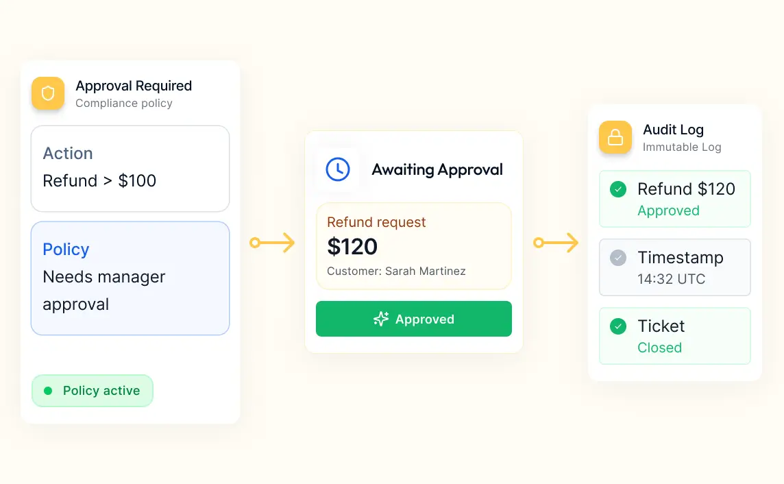 Maintain visibility and governance with approval flows, audit logs, and human-in-the-loop controls.