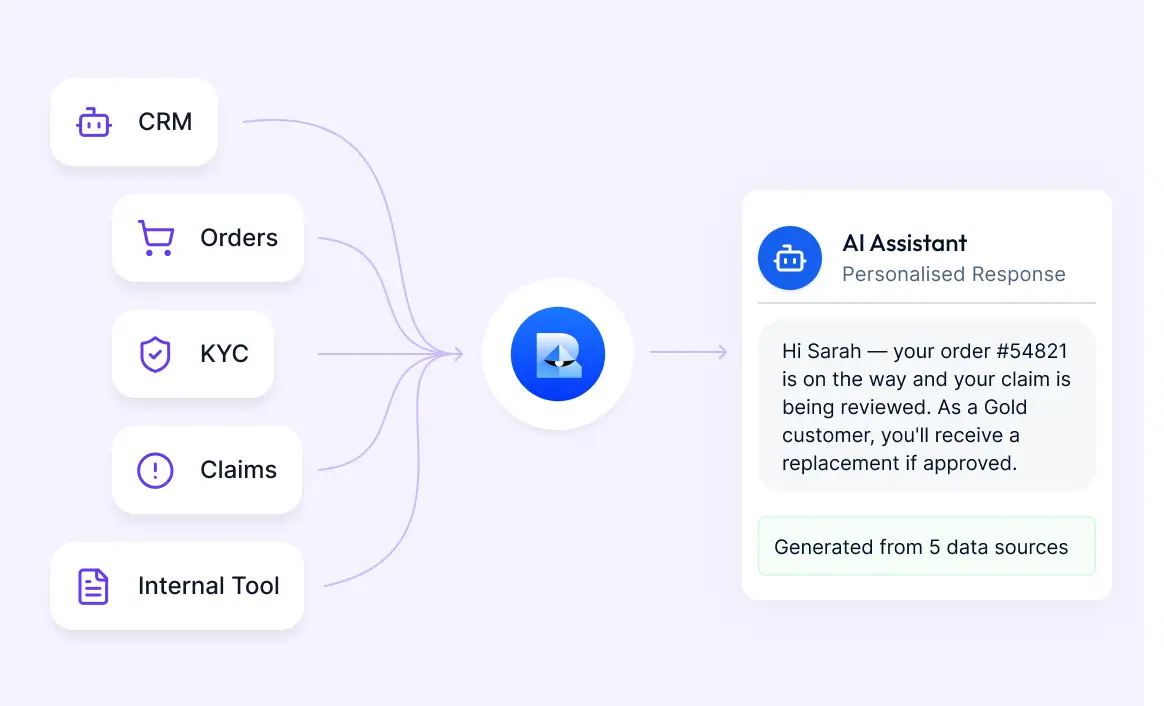 Connect CRMs, order systems, KYC, claims, and internal tools so answers are personalized.