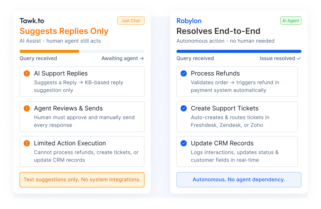 Support teams running transactional, action-heavy workflows across chat, WhatsApp, and voice — who need AI that acts, not just answers.