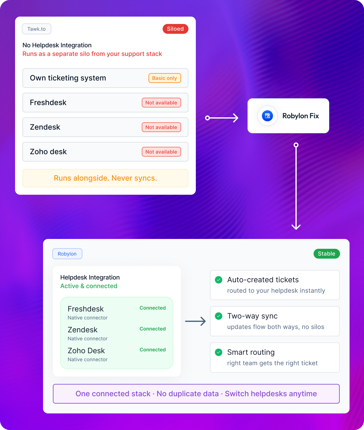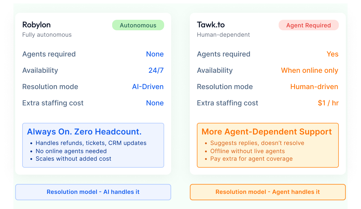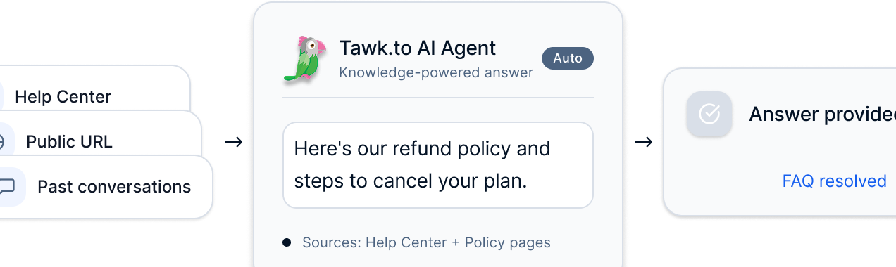 Layers onto Freshdesk, Zoho Desk, Zendesk as an AI agent. No migration. Team stays in existing inbox.