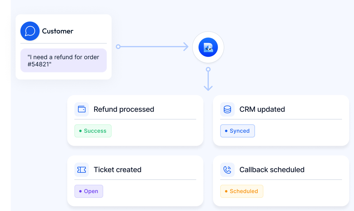 Custom actions for any SOP — refunds, CRM updates, callback scheduling, API calls to backend systems. Ships in days
