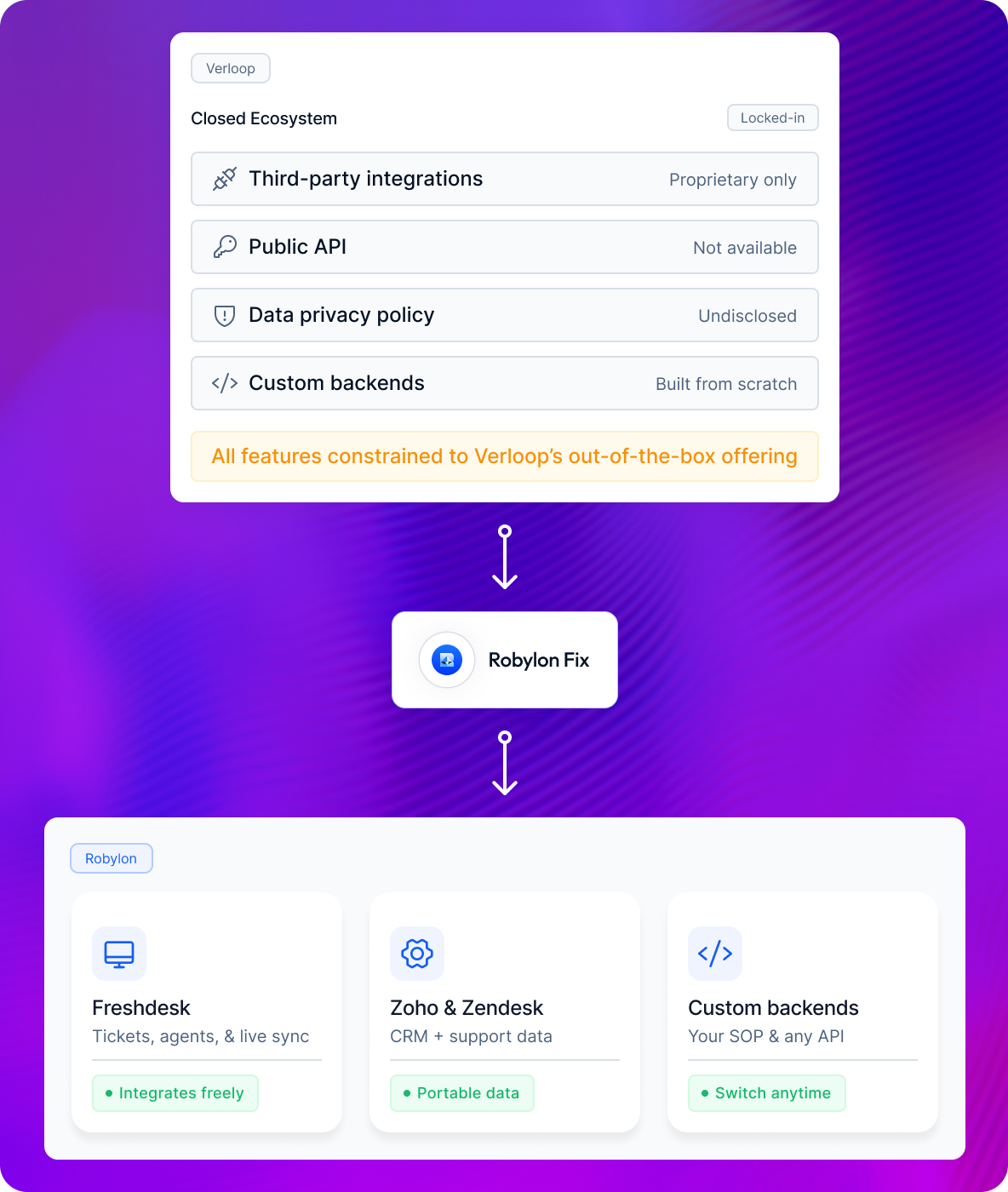 Plugs into Zendesk, Freshdesk via basic integrations. Limited API for deep customization.
