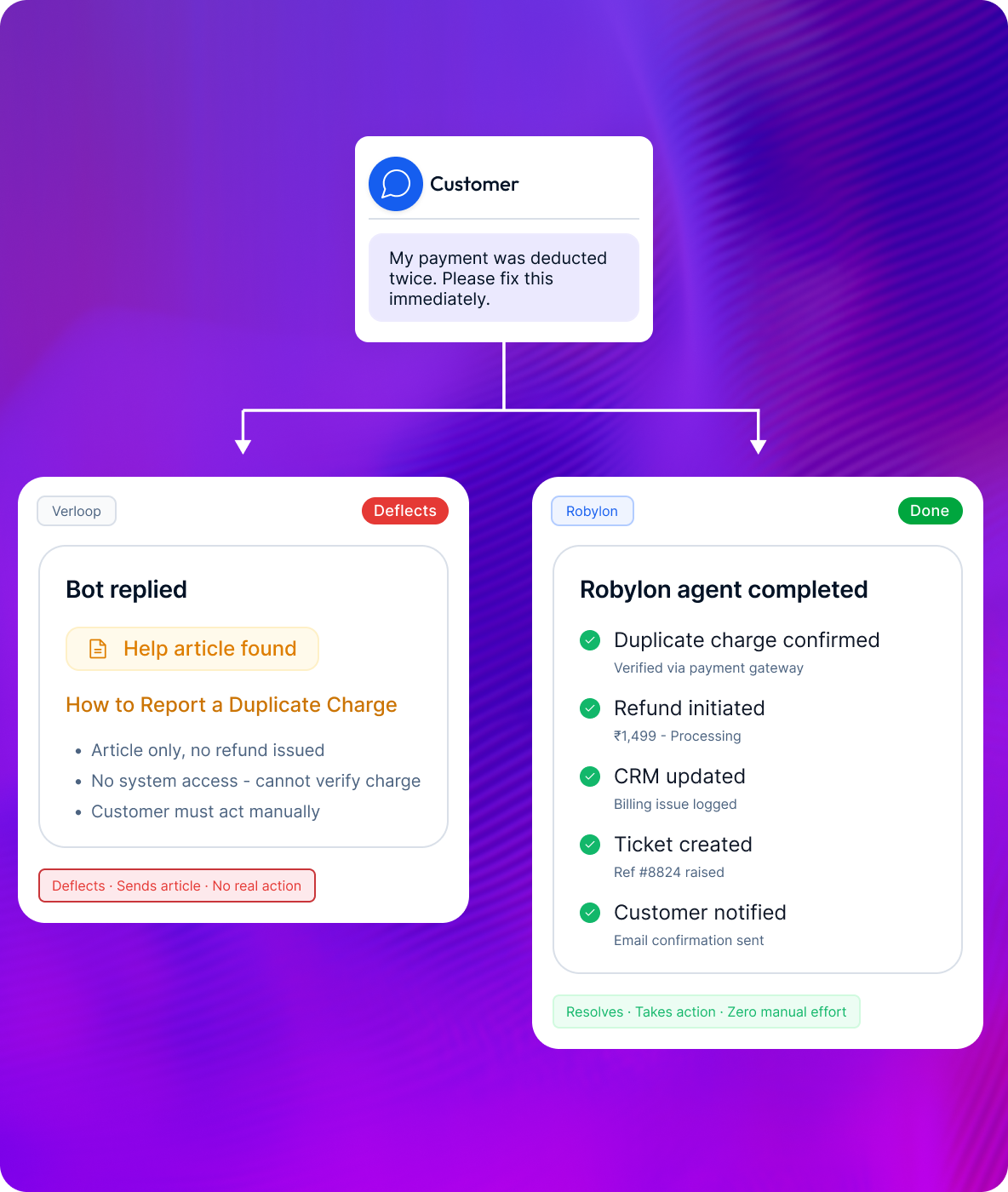 Action-first. Pulls live customer data, executes refunds, creates tickets, updates records. Resolves