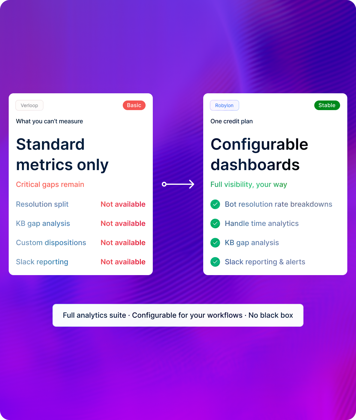 Bot resolution rate, handle time, chat disposition, KB gaps — with configurable dashboards and Slack reporting.