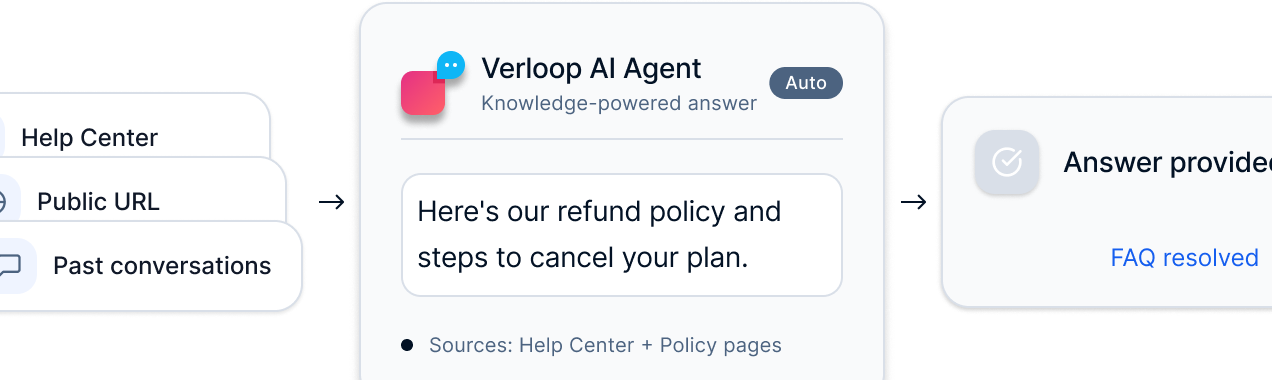 Deflection-first. Surfaces FAQ answers from knowledge base. Routes to human agents for anything complex.