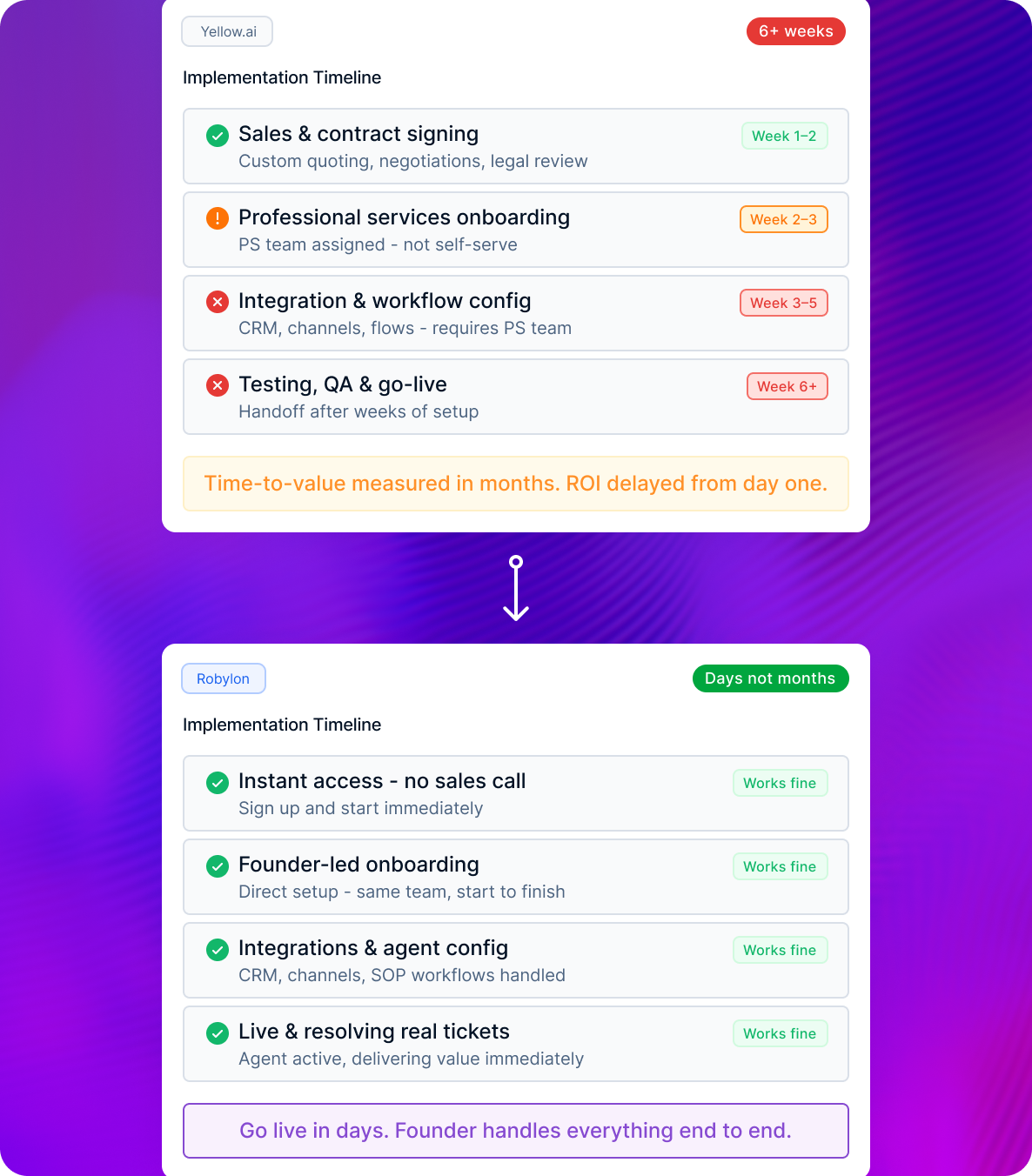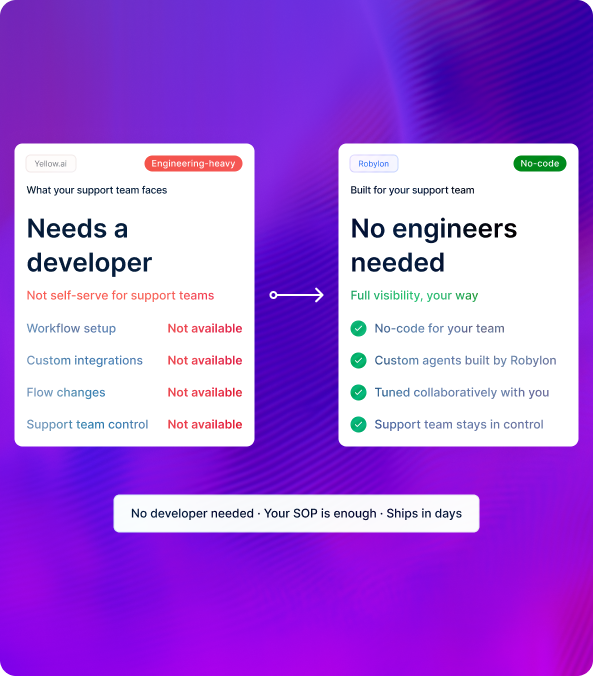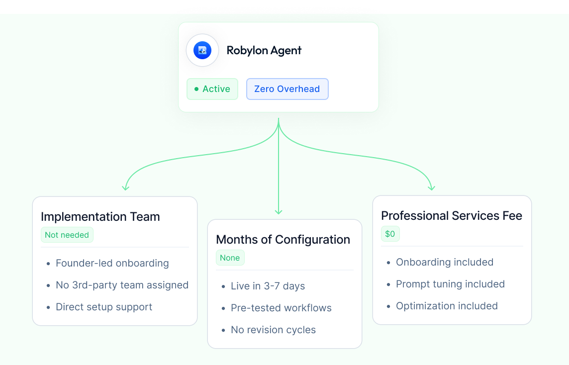 3–7 days. Founder-led onboarding. SOP ingestion, custom prompts, Freshdesk/Zoho/Zendesk integration.